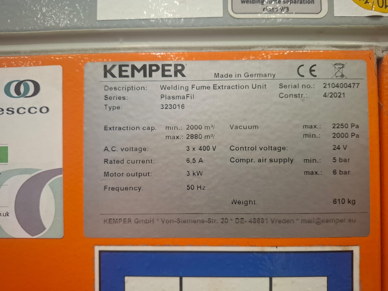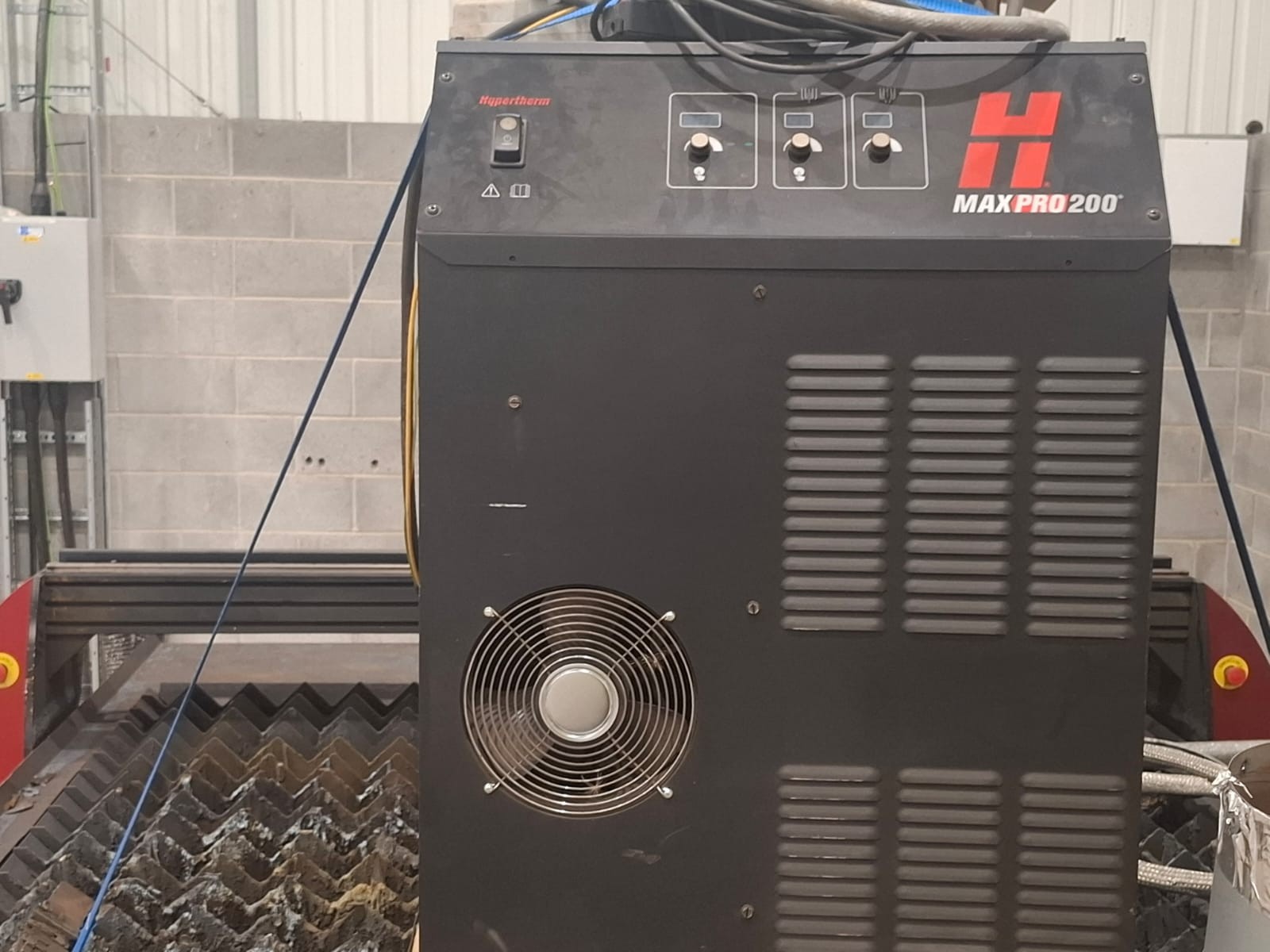 Hypertherm Max Pro 200 plasma source, Kemper Plasmafil extraction unit, mobile control console, manuals